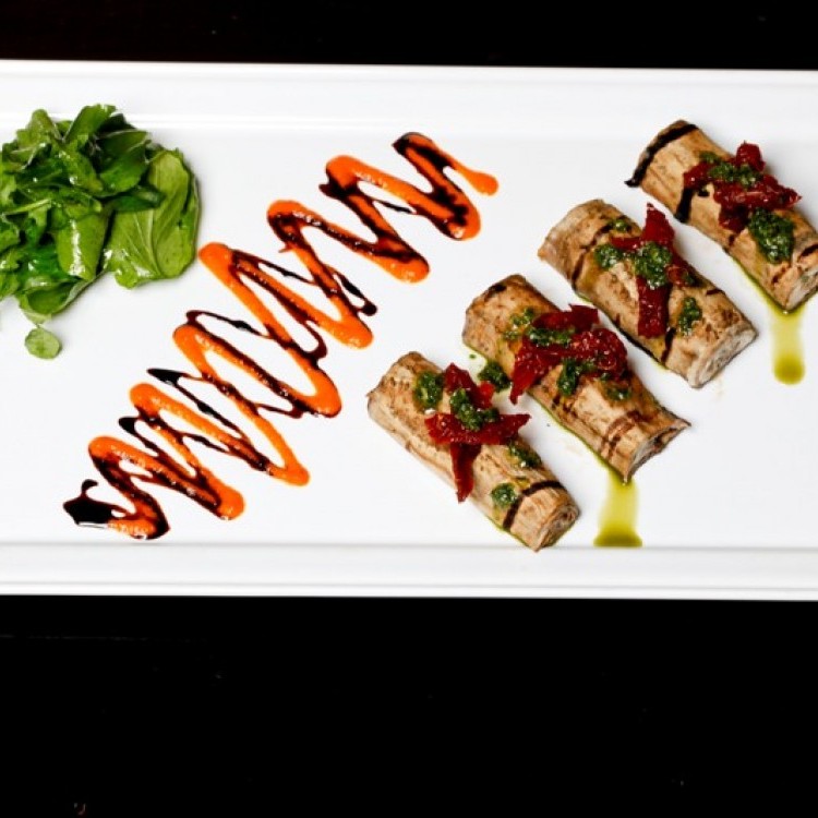 4 تقطّع البدورة المجففة، وتوضع أصابع الباذنجان في طبق التقديم مع الجرجير وخلّ البلسميك، ويزيّن بالبندورة المجففة.