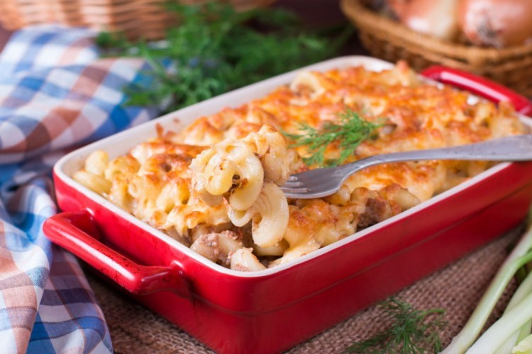 5. ضعي الباستا في طبق الفرن وصبي مزيج الجبن والحليب فوقه.