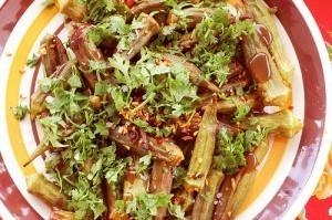 - يسكب هذا المزيج بدوره فوق البامية المقلية ويزين الطبق بالكزبرة قبل تقديمه .