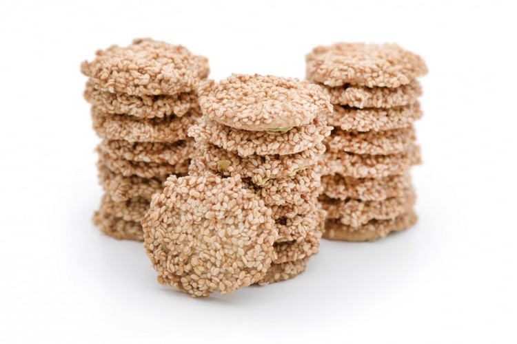 - غمّسي جهة من العجينة بالقطر ومن ثمّ بمزيج الفستق واللوز، وغمّسي الجهة الثانية بالقطر ومن ثمّ بالسمسم المحمّص.