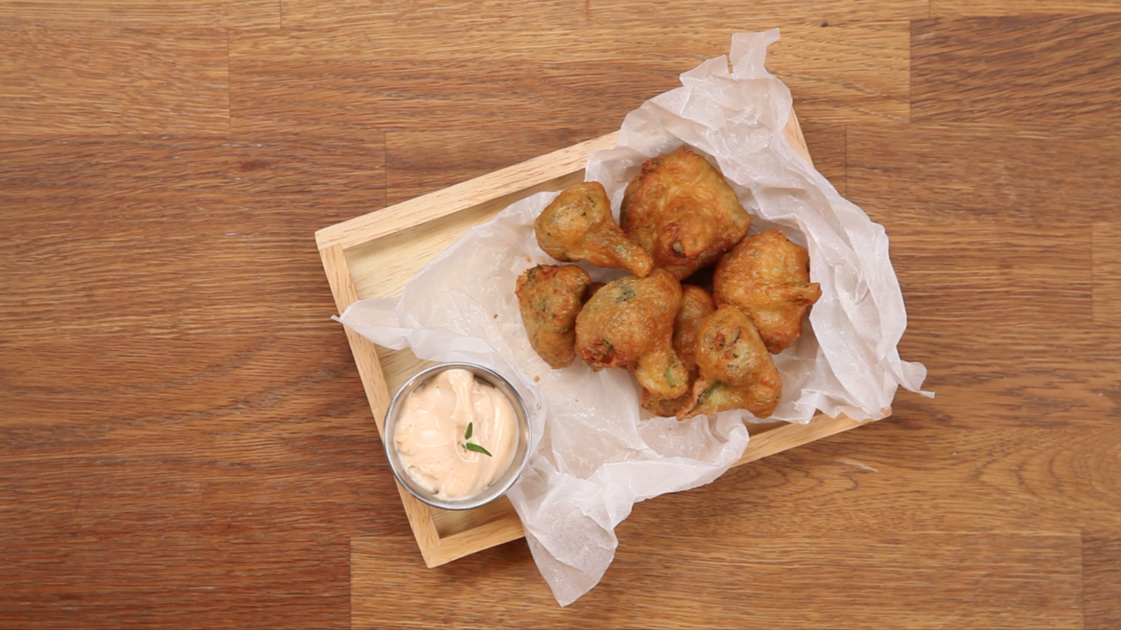 يغمس البروكولي في المخيض. يقلى من 2 إلى 3 دقائق حتى يصبح لونه بنياً ذهبياً في الزيت الحار، يصفى ويقدم مع بصلصة المايونيز بالسريراتشا الحارة.