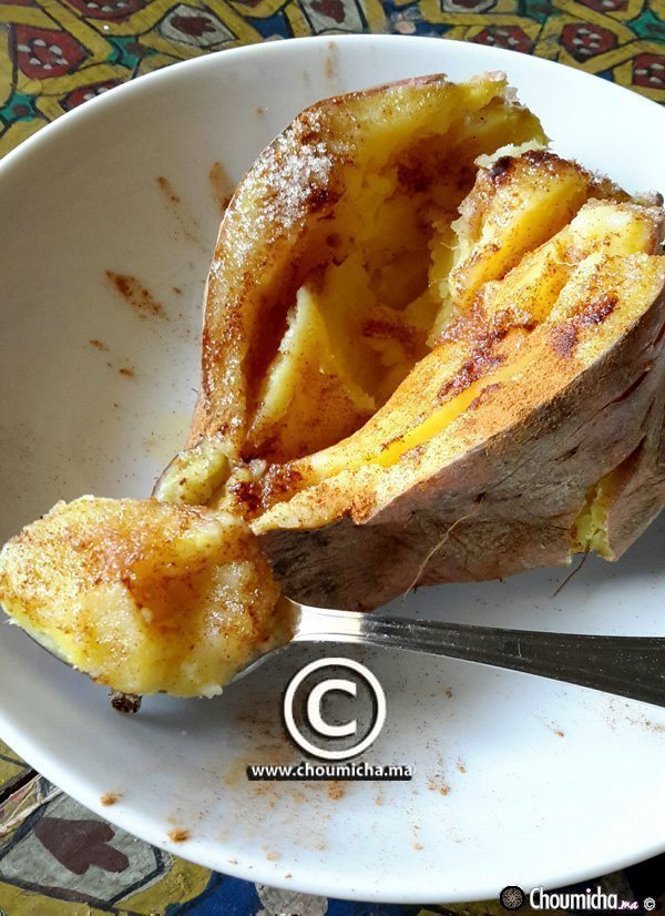 - يضغط على جانبي البطاطا لإخراج لبها قليلا. ينسم لب البطاطا بالقرفة، السكر الخشن والزبدة.