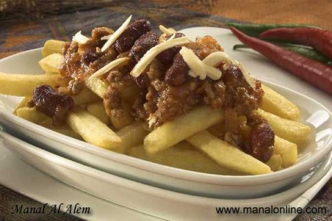 - ضعي البطاطس المقلية الساخنة في اطباق تقديم فردية، انثري فوقها جبن الشيدر، وزعي كمية من صلصة اللحم فوق كل طبق، ثم بعض الجبن، قدميه ساخنا مع المخللات.