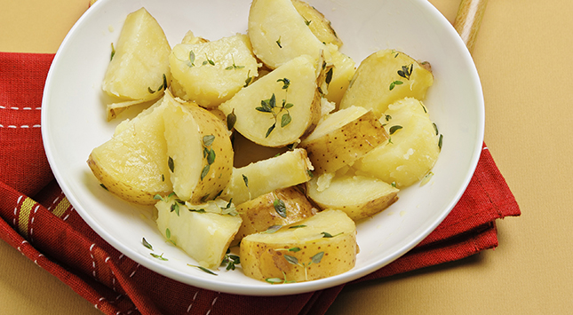توضع البطاطس في مبخرة معدنية، وتوضع المبخرة في قدر كبيرة الحجم بها ماء يغلي برفق. تُطهى البطاطس مُغطاة لمدة 12 دقيقة أو حتى تطرى.