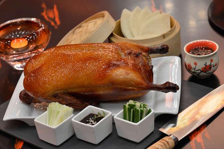 6. تُطهى البطة في الفرن، وذلك لثمانين دقيقة. وحين تنضج، تُقطّع إلى شرائح، وتُلفّ بخبز المرقوق، مع الخيار وبصل الربيع وصلصة هويسن.