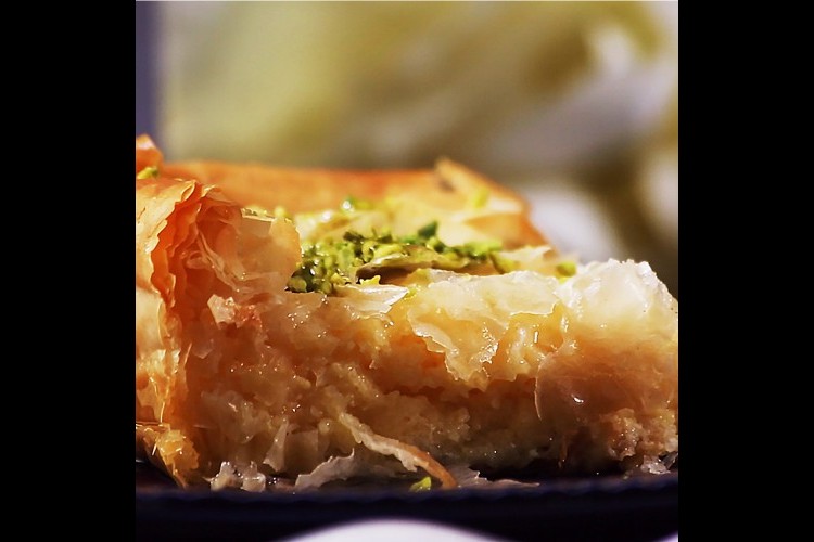 8. أخرجيه من الفرن ثم مباشرة صبي عليه القطر. دعي البقلاوة تبرد قليلا وانثري الفستق وقدميها باردة.