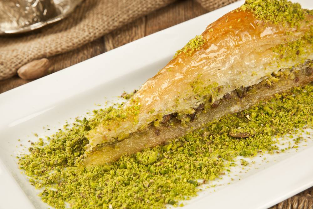- يضاف القطر مباشرة ثم ترش بالفستق وتترك البقلاوة حتى تبرد تماماً وتقدم.