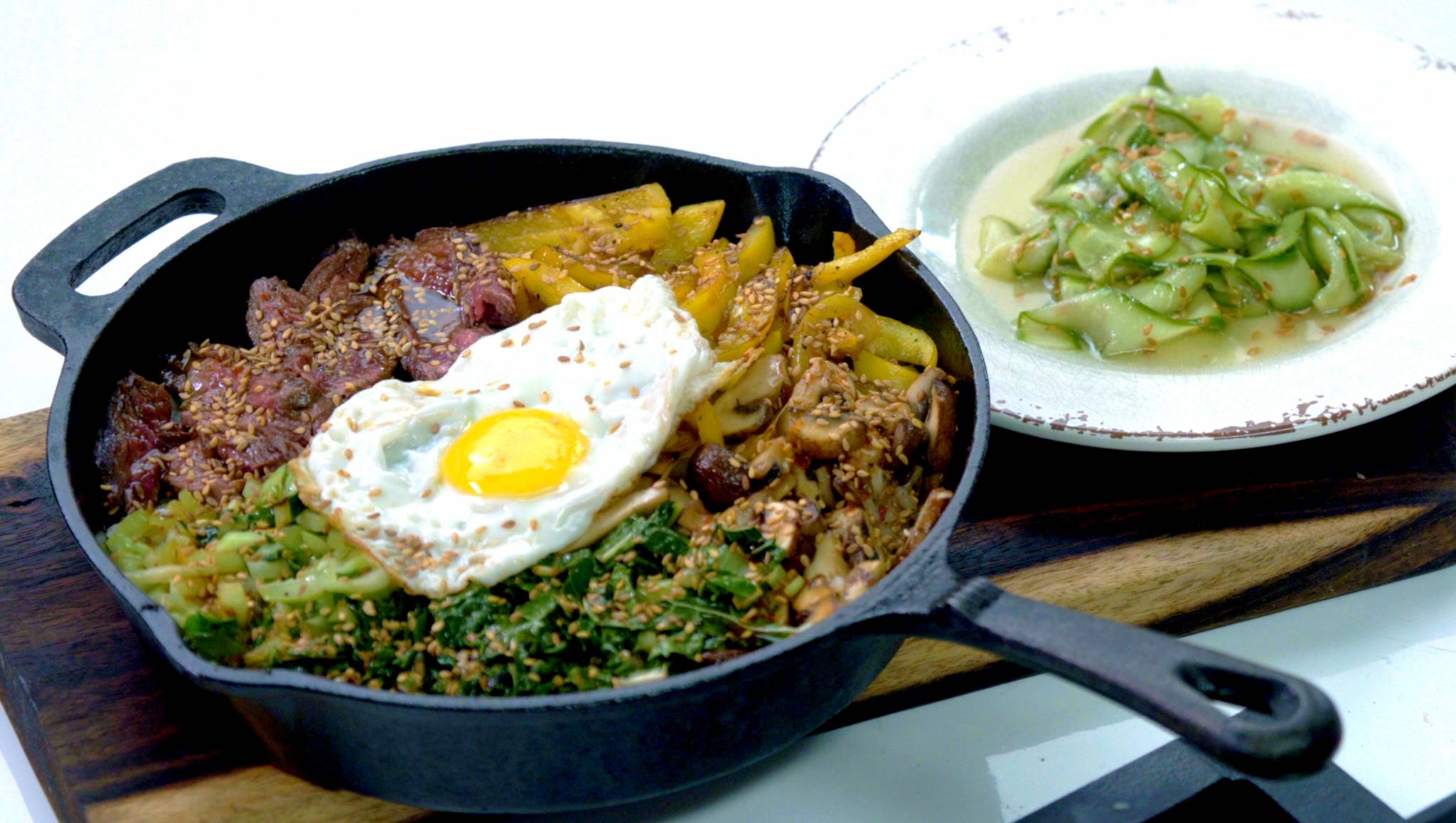 نضع الصوص على الأرز و يترك على نار مرتفعة لتحمير القاع لمدة6 – 4 دقائق و يرش بالسمسم المحمص و يقدم إلى جانب الخيار المخلل