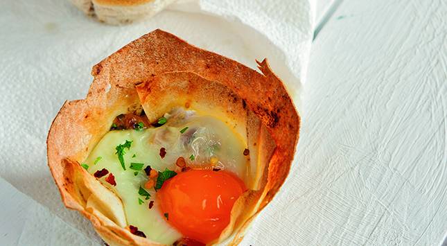 يُغرف القليل من حشو الطماطم في كل كوب من خبز البيتا، مع تقسيمه على الستة أكواب. تُكسر بيضة واحدة في كل كوب من خبز البيتا. للحيلولة دون امتلاء الأكواب، يُزال القليل من بياض البيضة إذا دعت الحاجة، وللحيلولة أيضًا دون ارتفاع صفار البيض كثيرًا، يُرجى التأكد من أنه متساوٍ مع البياض، وإلا سيجف الصفار أثناء الخبز.