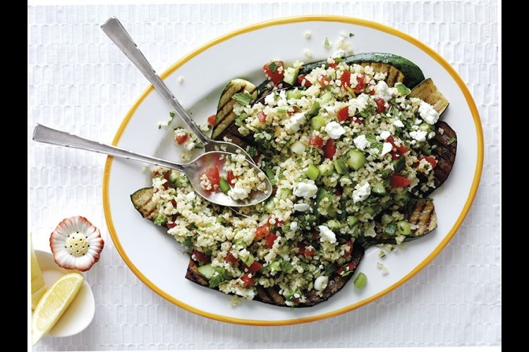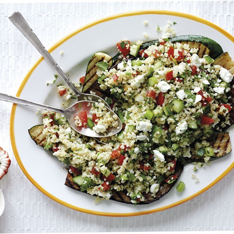 6. تُوزّع شرائح الباذنجان والكوسا في طبق التقديم كبير الحجم، ويُوزّع خليط الخضراوات والبرغل فوقها بواسطة الملعقة، ويُزيّن الطبق بجبن الـ”فيتا”.