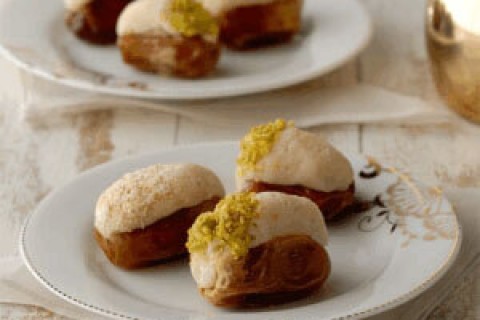 - تؤخذ كميّة صغيرة من معجون اللّوز الذي تم تحضيره سابقاً، وتُلفّ بواسطة اليد لتكوّن شكلاً بيضاوياً، وتوضع في داخل حبّات التمر.