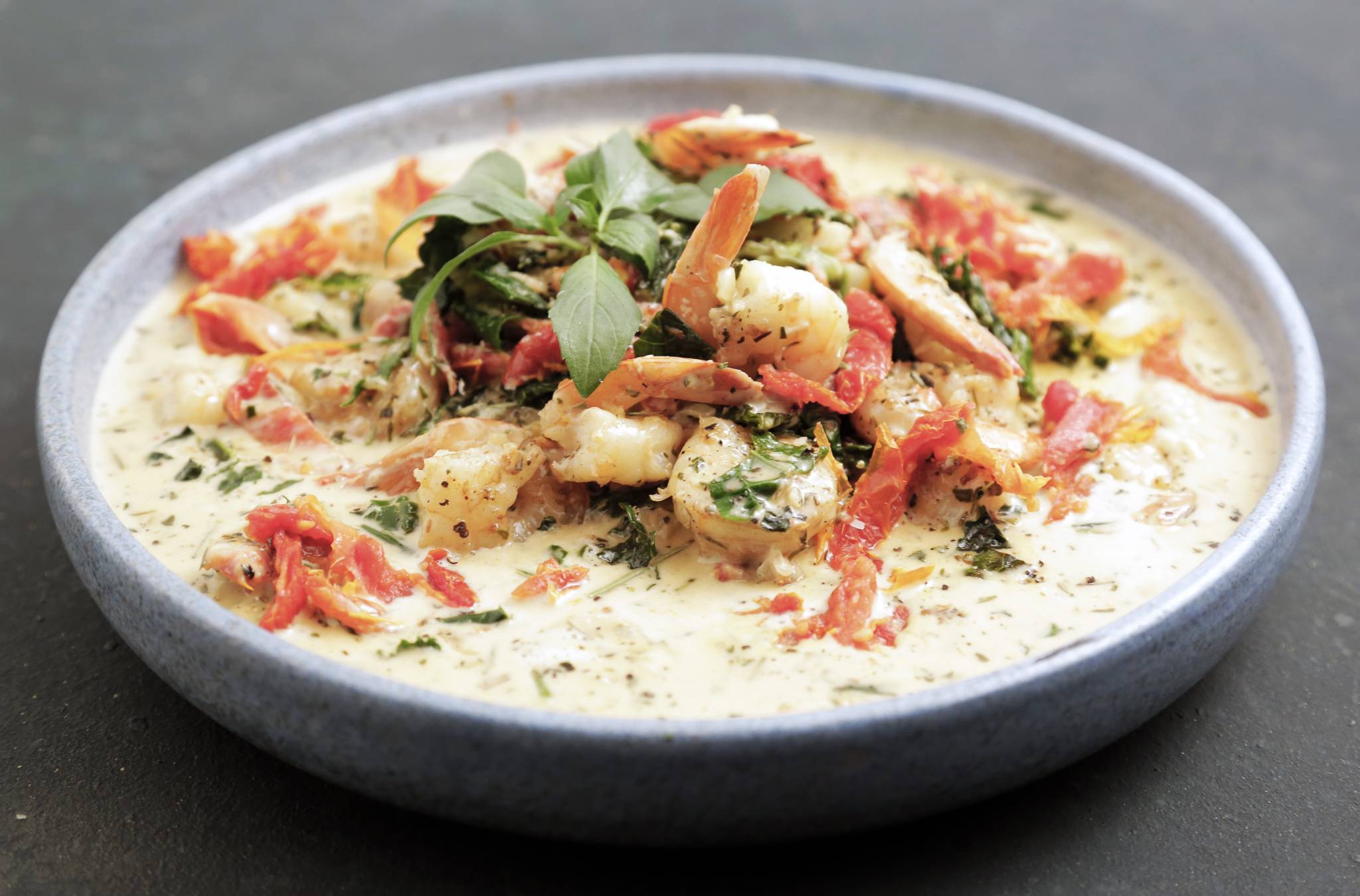 يضاف الجمبري المحضر مسبقا ويترك الخليط يغلي لمدة ٥-٧ دقائق ثم تضاف الجبنة البارميزان