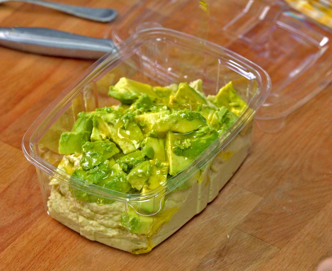 نقطع نصف قطعة الأفوكادو المتبقية إلى مكعبات و توضع فوق الحمص و يعصر القليل من الليمون لمنع تغير لون الأفوكادو