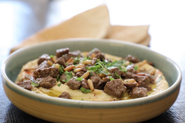5. للتقديم: ضعي الحمص في طبق التقديم، وأضيفي اللحم على الوجه.