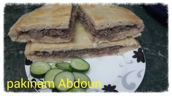 - نفرد قطعة ثانية من العجينة بسمك ربع سم وناخذها نضعها على القطعة الاولى التى عليها اللحمة ونقفل الاطراف مع بعض .