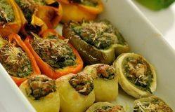 - يُدهن قالب فرن بقليل من الزيت ، تُحشى الخضروات بخليط السبانخ والكريمة، تُرص في القالب ويُوزع فوقها قليل من جبن البارميزان