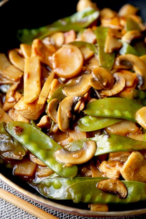 الدجاج الصيني بالخضار snow peas وصفة صينية عبارة عن دجاج مع فطر أبيض وغيره من الخضراوات، ومن أشهر الخضراوات المستعملة في هذه الوصفة البازلاء الصغيرة وبراعم الخيزران .