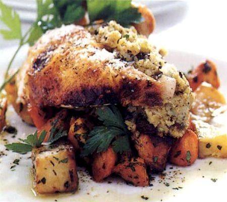 - احشي الدجاجتين بخليط الأرز والبصل الزبيب، ثم ضعيهما في صينية مدهونة بالزبد