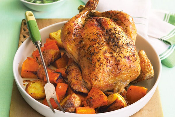 4. أدخلي الدجاجة للفرن المحمى مسبقاً لمدة ساعة ونصف تقريباً أو حتى النضوج.