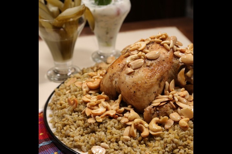 4. قدمي الدجاج المحشي فريكة ساخناً بجانب تشكيلة من السلطات بحسب الرغبة.