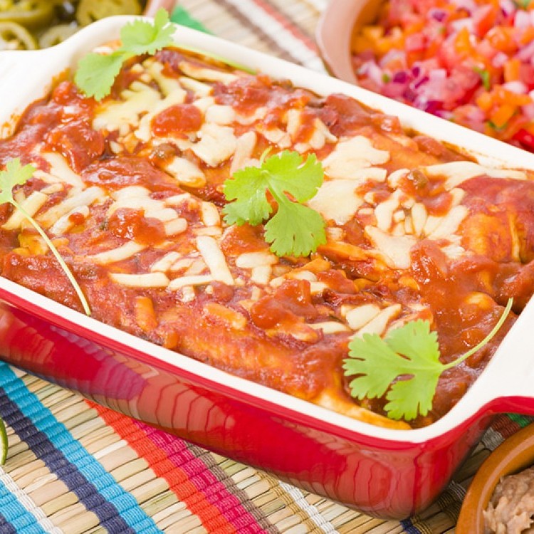 5. ضعي الدجاج المحمر في طبق الفرن ووزعي الجبن فوقه والصلصة المكسيكية وأدخليه الفرن لمدة 25 دقيقة حتى تتمازج النكهات وتذوب الجبنة وقدميه ساخنا.