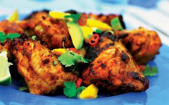 - يقدم الطبق مع قطع المانجو التي تم الاحتفاظ بها جانباً، وشرائح الليمون، والأفوكادو والكزبرة والفلفل.