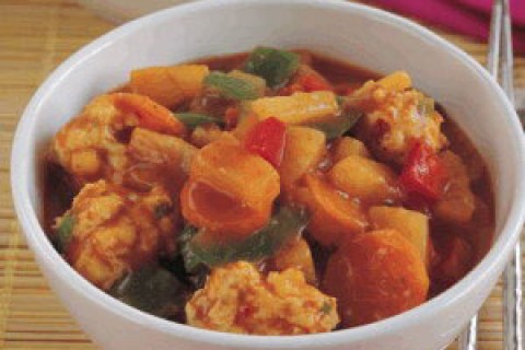 6. تُضاف كرات الدجاج إلى المزيج ويُقدّم الطبق مع الأرز المطبوخ على البخار.