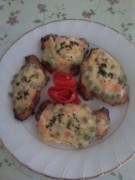- بعدما يستوي الدجاج يوضع فى طبق بايركس ونضع عليه ملعقه من خليط البشاميل وعليه شريحة جبن .