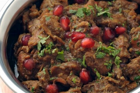 - يسكب في طبق التقديم ويزين باوراق الكزبرة الخضراء وحبوب الرمان الطازج ثم يقدم مع الارز او الخبز الهندي.. بالهنا والشفا.
