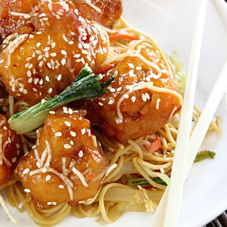 5. ضعي الدجاج في طبق التقديم و صبي الصوص فوق الدجاج و انثري السمسم فوقه قدميه إلى جانب النودلز أو الأرز الأبيض.