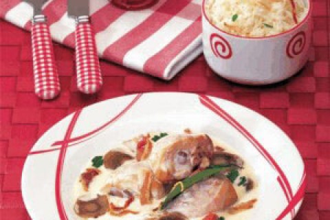 3. يُضاف مكعّبا مرقة الدجاج ماجي، الحبش المدخّن، والماء، وتُمزج المكوّنات جيداً. توضع قطع الدجاج من جديد في المقلاة ويُغلى المزيج. يُغطى ويُترك على نار هادئة لمدّة تتراوح بين 30 و35 دقيقة أو حتّى تنضج قطع الدجاج.
