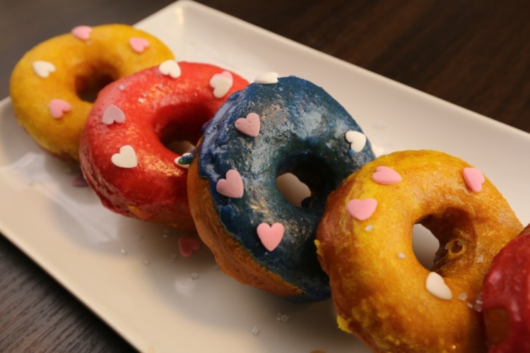 7. لغلاف السكر لتزيين الدونات: نضع 1 كوب سكر بودرة مع لون طعام ثم 3 ملاعق كبيرة حليب، ويحرك السكر جيداً، ثم تغلف بها حبات الدونات.