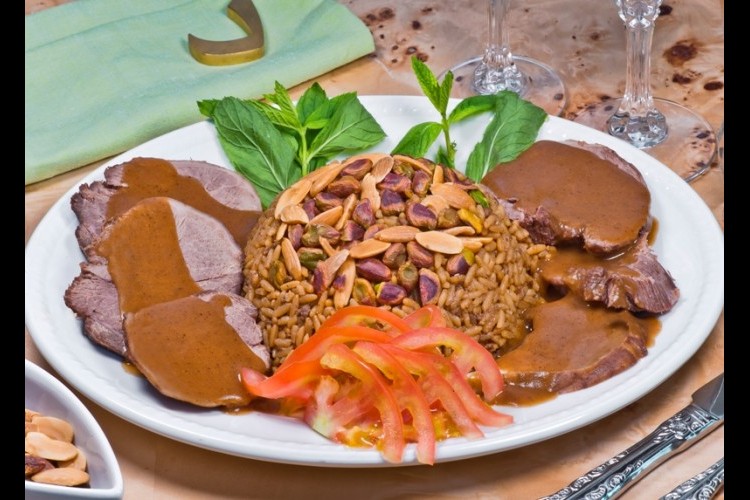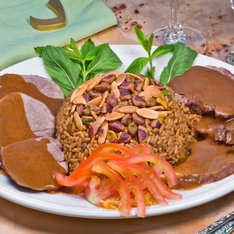 5. طريقة التقديم: يُقطّع فخذ الغنم إلى شرحات دائرية. ويسكب الأرز وسط طبق مستطيل، ويزيّن سطحه بالمكسرات المحمصة، وجوانبه بشرحات لحم الغنم، مع القليل من الصلصة. كما يُقدم القليل من الصلصة، إلى جانب هذا الطبق، وذلك في وعاء مخصّص للصلصات.