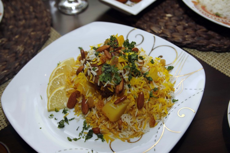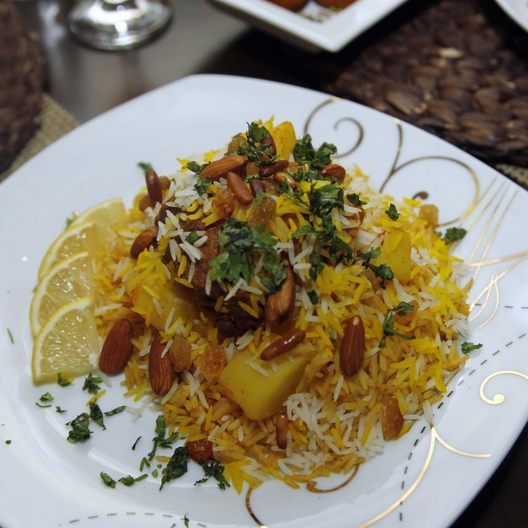 4. وزّعي الأرز على خليط اللحم، ثم اسكبي ماء الكادي والزعفران عليه، واتركيه على نار هادئة، حتى نضوج الأرز بصورة تامّة.