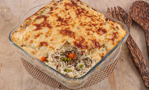 5. في طبق فرن زجاجي متوسط الحجم توضع طبقة من البشاميل ثم طبقة من الأرز ثم طبقة اللحم المفروم ثم طبقة أخرى من الأرز ثم يغطى جيدا بالبشاميل.