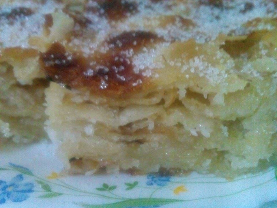 ندهن الصينيه سمنة وبعدين ناخد رقاقية ونبلها ميه من الحنفية بلة خفيفة يا دوب تطرى وبعدين نضعها فى الصينيه وندهنا سمنةونكرر العملية مع باقى الرقاق بعد الرقاقة التالته نضع المكسرات اللى عندكثم نضع التلاتة التانين زى متفقنا مبلولين ومدهونين سمنه وبعدين دخليها الفرن حتى تحمر وممكن تسويها على البوتجاز من فوق الى ان تحمر ثم قومى بقلبها وضعى سمنه عليهاوبعد ما تحمر اخرجيها من الفرناو من على البوتجاز وتكونى انتى مسخنة اللبن مضاف اليه السكر ثم قومى بصب اللبن على الصينية وبالهنا والشفا