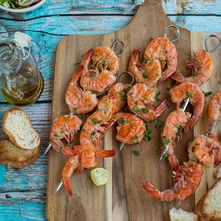 3. يُتبّل الروبيان بالتتبيلة جيّدًا (مع الاحتفاظ بكمّ قليلٍ من التتبيلة)، ثمّ توزّع حبّاته على الأشياش الخشب، بعد نقع الأخيرة بالماء لعشر دقائق.