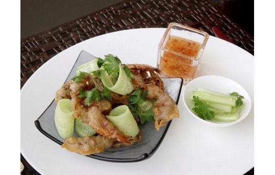 5. يقدّم الروبيان المقلي بجانب الصلصة وسلطة الخيار، ويزيّن هذا الطبق بشرائح الخيار والكزبرة.