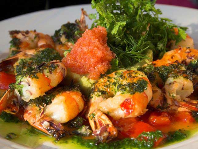 2. في صينيّة، يضاف الروبيان والكافيار، ويصبّ الخليط. ثمّ، يتمّ إدخالها إلى الفرن، حتى ينضج الروبيان. ويزيّن هذا الطبق بالبقدونس.