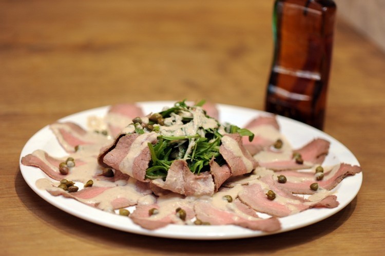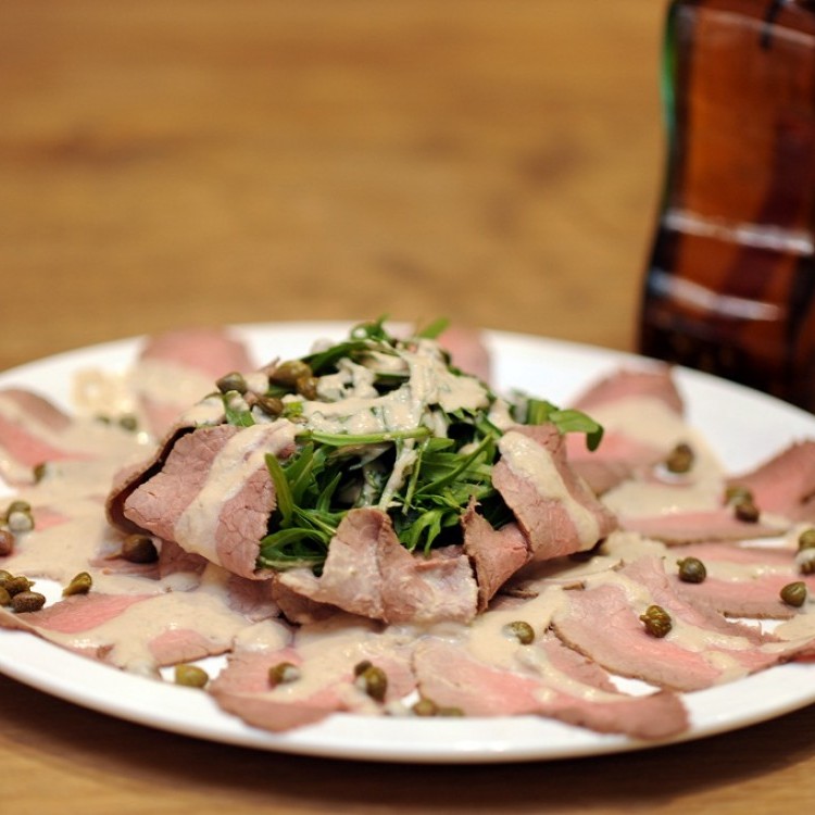3 تسكب الصلصة فوق الروستو، وينثر القبّار.