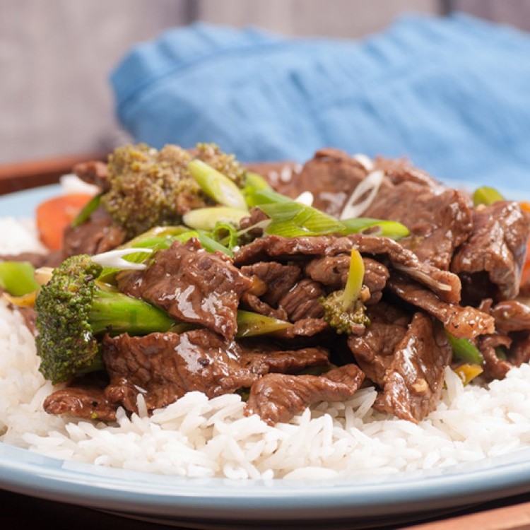 8. قدمي الأرز إلى جانب الستيك مع الصوص وزيني الطبق بالبصل الأخضر
