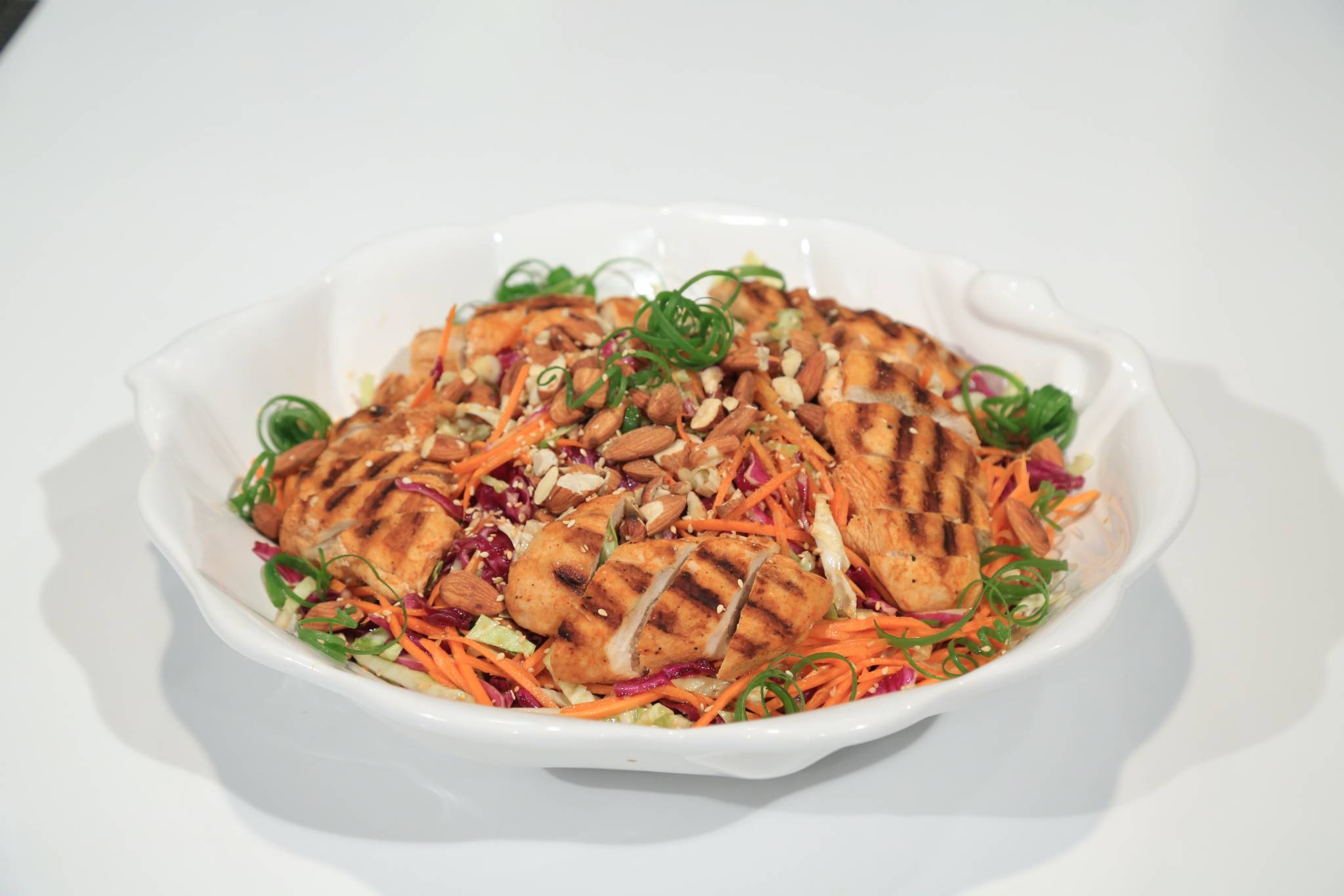 ضعي الدجاج عليها وزيني بالبصل الاخضر واللوز المحمص والكزبرة.