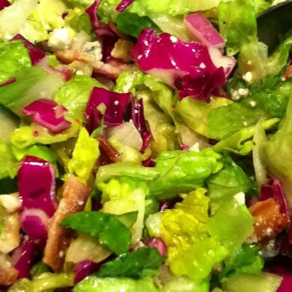 - وتصب فوق السلطة وتخلط وتزيين بشرائح من جبن البارميزان.