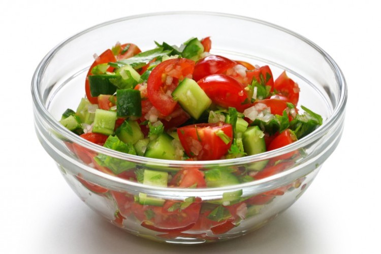 - نقطع الخضار أي الخيار والطماطم والبصلة ونضيفها إلى الوعاء فوق الخس ونحرك قليلاً.