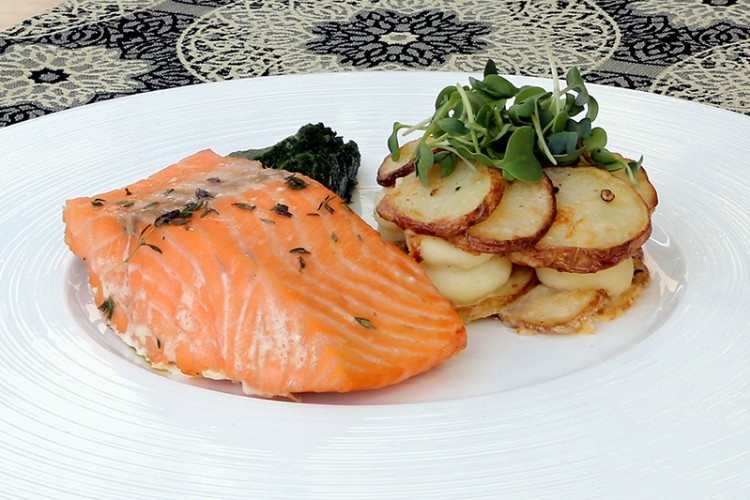 2. توضع قدر متوسّطة الحجم، ومملوءة بالماء النقي على النار، ثم توزّع قطع السلمون على شبكة الطهي، فوق الماء، وذلك حتى تُطهى ببخار الماء، وتنضج بصورة تامّة.