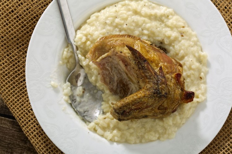 16. ضعي الأرز في طبق التقديم وضيفي قطع الدجاج على وجه الطبق.