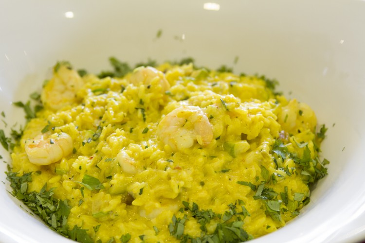 8. أضيفي المزيج للأرز ثم أضيفي حوالي 100 مل من المرق وقدميه ساخناً.