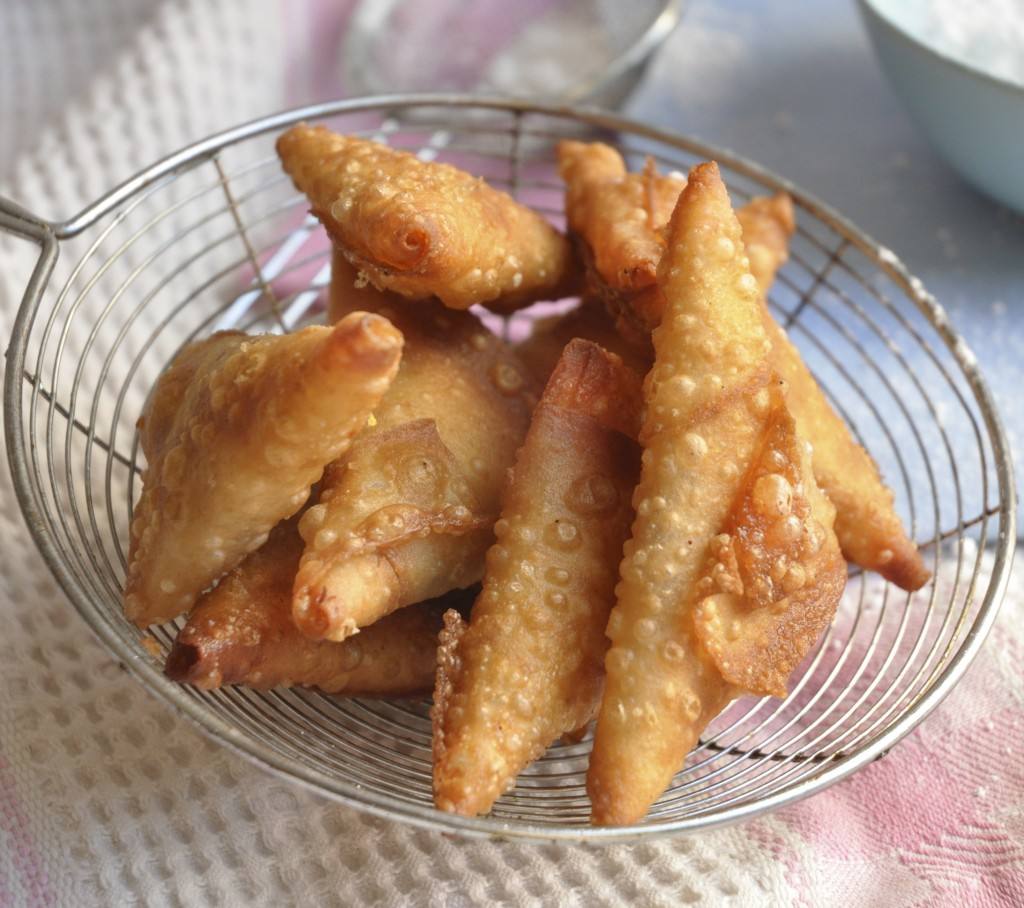 - يحمى الزيت جيداً ثم تقلى السمبوسك حتى تتحمر ثم ترفع وتوضع مباشرة في القطر.