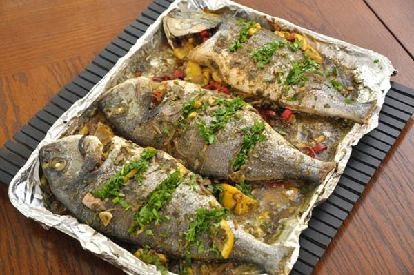 5. غطي السمك تغطيةً خفيفةً عبارة عن قطعة من ورق “الألومينيوم”. ثم، ضعي الصينية في الفرن إلى أن ينضج السمك. أبعدي “الألومينيوم” قبل إخراج الصينيّة ببضع دقائق ليتحمّر سطح السمك قليلاً. ثمّ، قدّميه.