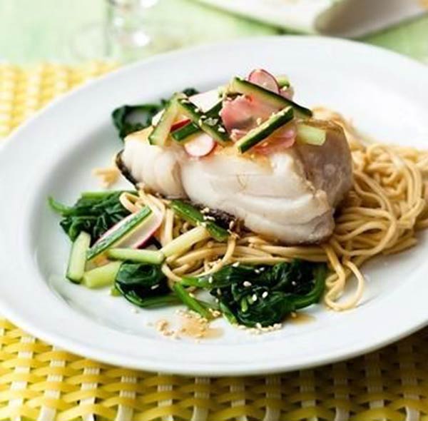 6. تضاف ملعقة زيت السمسم إلى “النودلز” التي توزّع على أطباق أربعة، وكذلك الأمر بالنسبة إلى السبانخ، وتوضع كل قطعة من السمك على سطح كل طبق، ويضاف الخيار والفجل، وينثر السمسم.